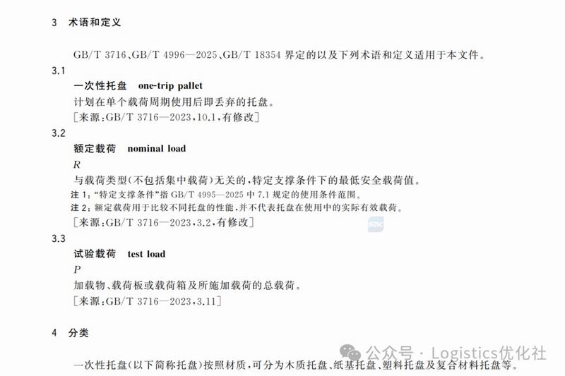 新增了“一次性托盤”“額定載荷”“試驗(yàn)載荷”三項(xiàng)核心術(shù)語的明確定義,完善了標(biāo)準(zhǔn)基礎(chǔ)概念體系,為后續(xù)技術(shù)要求的描述提供了統(tǒng)一的語言基礎(chǔ)。